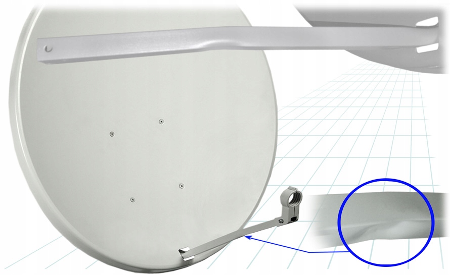 Uwaga ! – w tym modelu anteny (Corab 90 cm) wysięgnik konwertera posiada fabryczne przetłoczenie służące dopasowaniu konwertera do ogniska anteny, to nie jest uszkodzenie tylko technologiczne, fabryczne przetłoczenie.