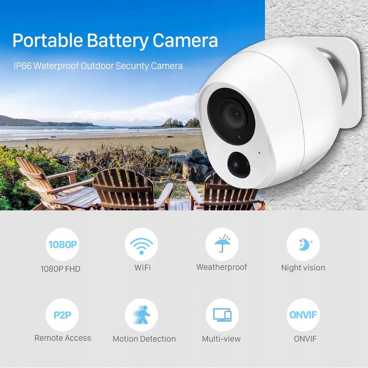 Kamera IP WIFI z akumulatorem bez konieczności podłączania do prądu, kamera pracuje na bateriach do 8 miesiecy, podglad online, obsługa kart micro sd. Kąt patrzenia kamery to aż 130 stopni. Funkcje : BLC, IR, HLC, Motion Compensation, WDR