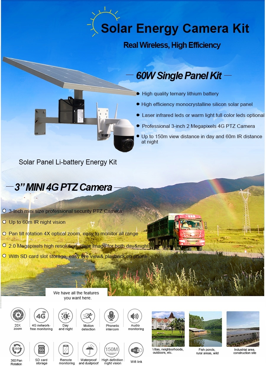 - Z zestawem energii słonecznej, panelem słonecznym 60 W + baterią litowo-jonową 30Ah + uchwytem + torbą na śrubę, do 50 godzin pracy bez przerwy, nawet bez ładowania.