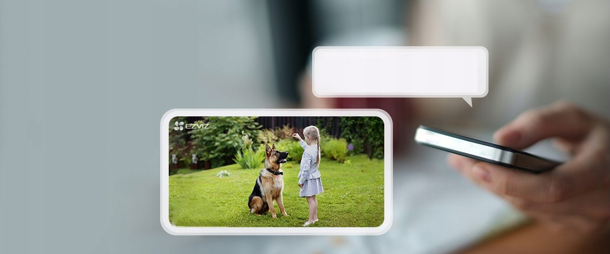 Łatwe zarzadzanie EB3 z aplikacji EZVIZ. Możesz też sterować podglądem na żywo za pomocą poleceń głosowych, np. powiedz „Hej Google” lub „Alexa”, aby wyświetlić obraz na dużym ekranie.