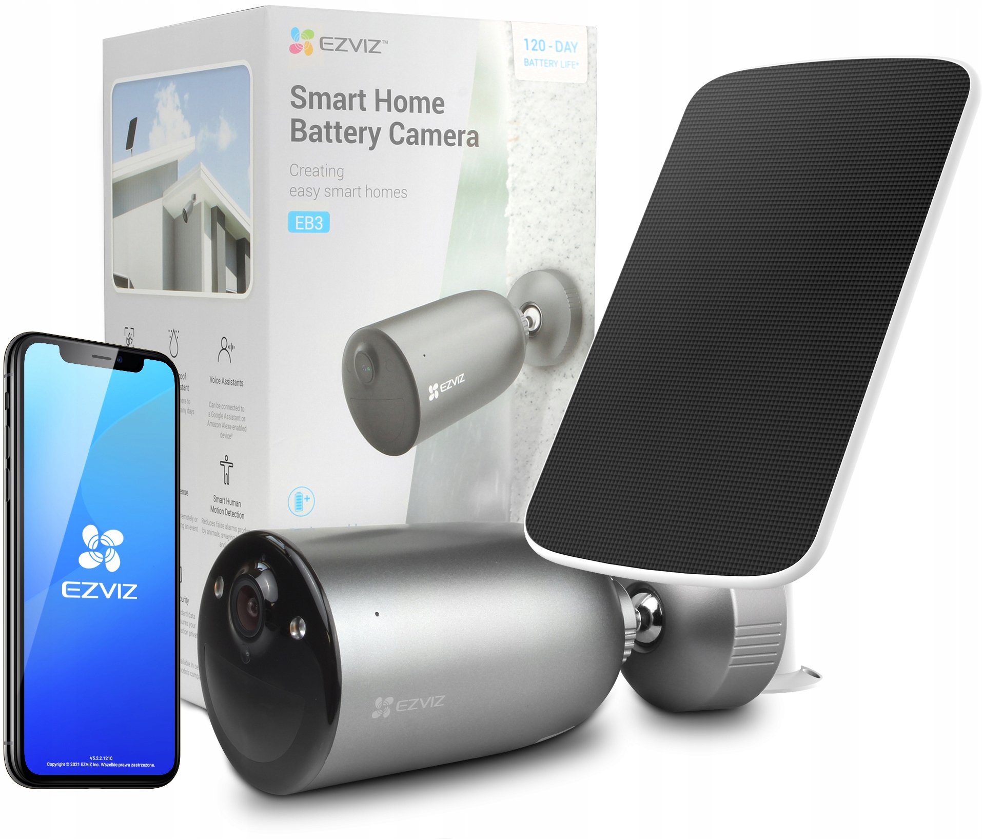 Kamera EB3, wyposażona w baterię wielokrotnego ładowania o pojemności 5200mAh, wymaga ładowania jedynie raz na 120 dni (zakładając, że kamera za pomocą detekcji nagrywa 5 minut materiału dziennie). Zawsze martwisz się poziomem naładowania baterii? Możesz kupić panel słoneczny EZVIZ, aby zapewnić nieprzerwane zasilanie kamery.