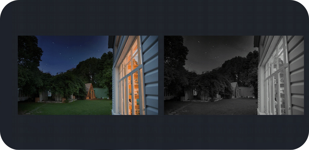 Rozmyty i rozpikselowany obraz w nocy to przeszłość. EB3 oferuje kolorowy tryb nocny, umożliwiający widzenie na odległość do 15 metrów. Co więcej, możesz wybrać między trybem kolorowym a trybem monochromatycznym w podczerwieni.