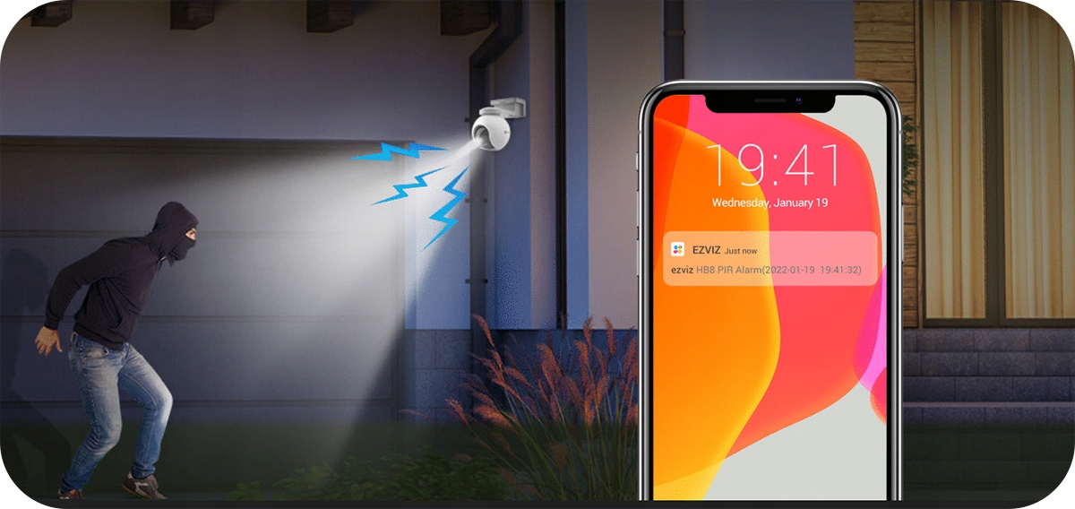 Funkcja obrony aktywnej kamery zapewnia dodatkową ochronę. Po wykryciu poruszających się niepowołanych osób kamera włącza głośną syrenę alarmową i dwa migające, odstraszające reflektory.