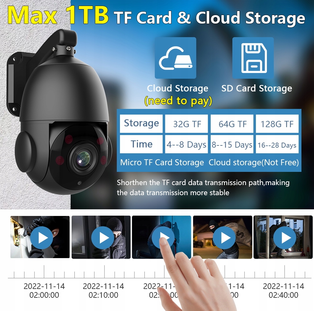 * Wbudowany pudełko na karty TF, obsługuje do 1TB; Obsługuje przechowywanie w chmurze (płatne);