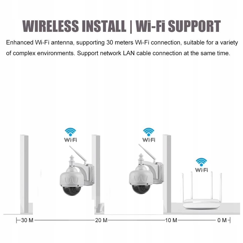 Kamera IP nie wymaga tworzenia infrastruktury sieciowej (kabli). Wyposażona w kartę WiFi łączy się z komputerem, telefonem, tabletem, a wydajna antena o mocnym sygnale i system redukcji zakłóceń NOISE-DEFENDER© sprawiają, że przesyłane dane są mniej podatne na zakłócenia i szumy.