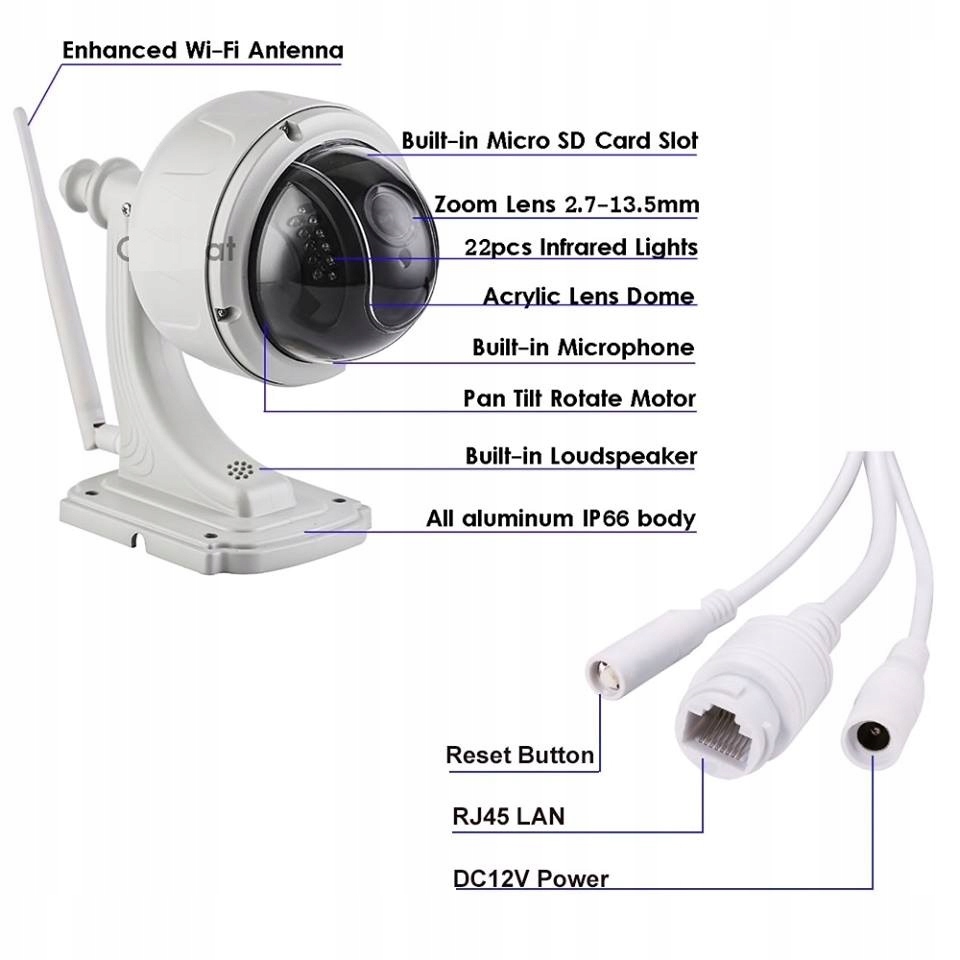 Obrotowa kamera  wyposażona została w funkcję Pan-Tilt-Zoom (PTZ), przez co możliwe jest dobranie odpowiedniego do wymagań położenia kamery oraz przybliżanie obrazu. Zmienna ogniskowa w zakresie 3,3 – 12 mm pozwala na osiągnięcie 5 krotnego zoomu optycznego. Dzięki temu osiągamy zmienny kąt widzenia kamery od 40 do 125 stopni po przekątnej.