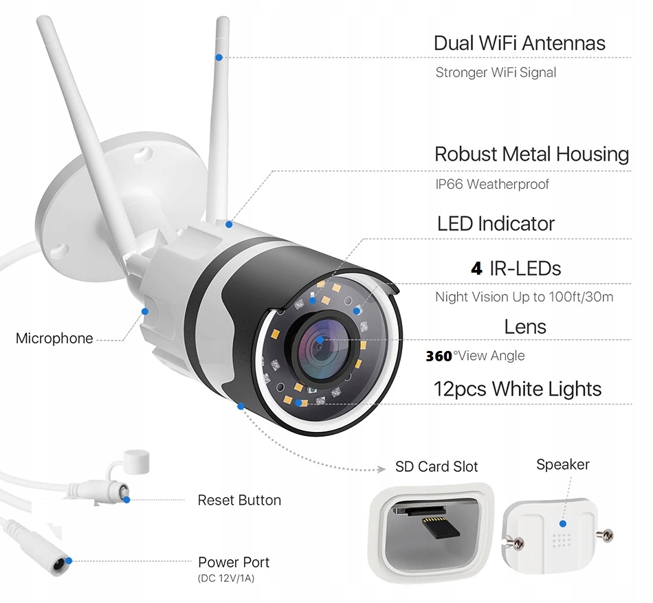 - Wykrywanie ruchu: powiadomienia alarmowe, nagrywanie na kartę SD, do 4 stref detekcji