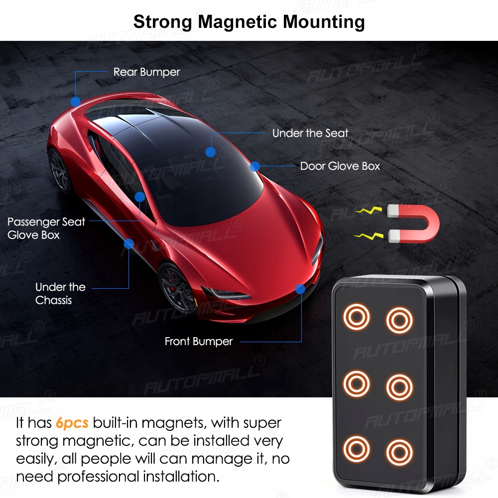 Lokalizator ten zainstalujesz m.in. na podwoziu samochodu, w bagażniku lub pod maską. Dzięki silnym magnesom neodymowym będzie mocno przymocowany do każdej metalowej powierzchni. W zestawie znajdziesz również adapter z płaską podkładką na silne taśmy 3M do mocowania innych nie metalowych elementów.