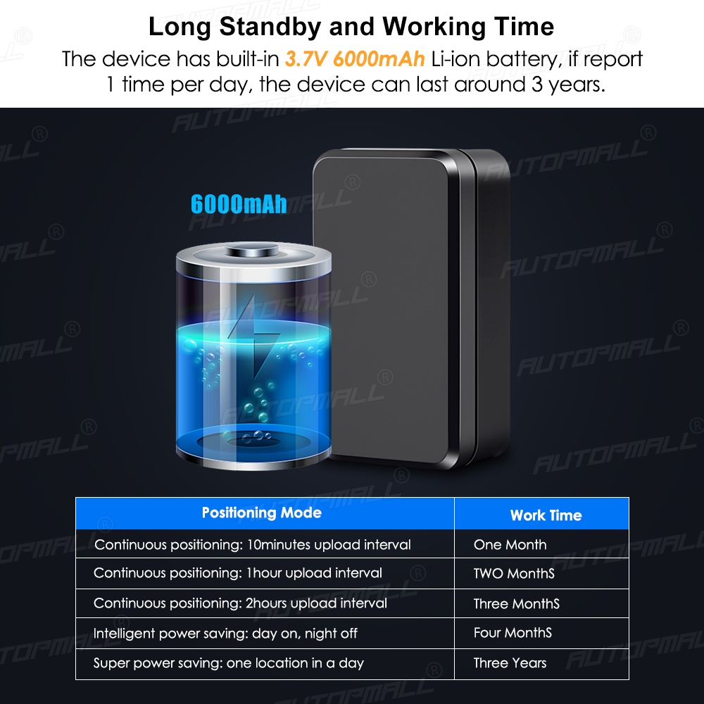 Wbudowana duża bateria o pojemności 6000 mAh potrafi zapewnić działanie lokalizatora nawet do 180 dni w trybie czuwania. To 20x większa pojemność akumulatora niż w innych lokalizatorach!