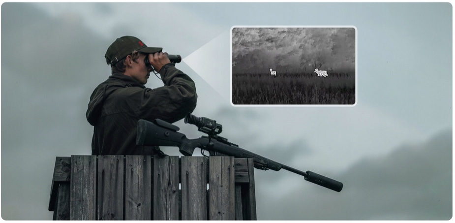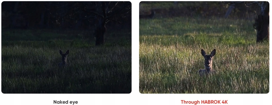 Jako lornetka multispektralna, kamera termowizyjna HABROK 4K zapewnia możliwość widzenia przez kamuflaż zwierząt i prezentowania ich sygnału cieplnego, nawet gdy znajdują się wśród zarośli lub liści. Umożliwia to szybkie skanowanie i skuteczność wyszukiwania w otwartych dziczy.