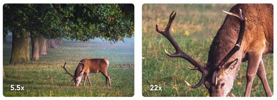 Zamiast stałego powiększenia przez lornetkę optyczną, powiększenie 5,5x-22x z długość ogniskowej 60 mm oznacza, że możesz swobodnie przybliżać i oddalać HABROK 4K od uchwycenia całego otoczenia do rozpoznania najmniejszych szczegółów, takich jak poroże jelenia lub cechy seksualne, w odległości 150 metrów w ciągu dnia.
