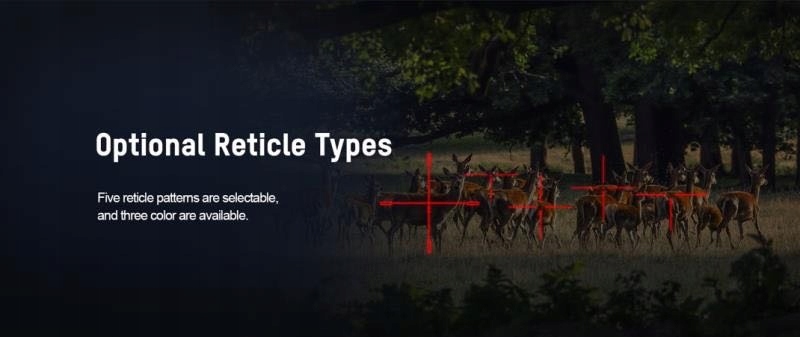 W trybie celownika termowizyjnego urządzenie oferuje aż 5 siatek celowniczych w 3 kolorach. Możemy tę opcję wyłączyć, gdy używamy Thundera jako nasadki lub monokularu.