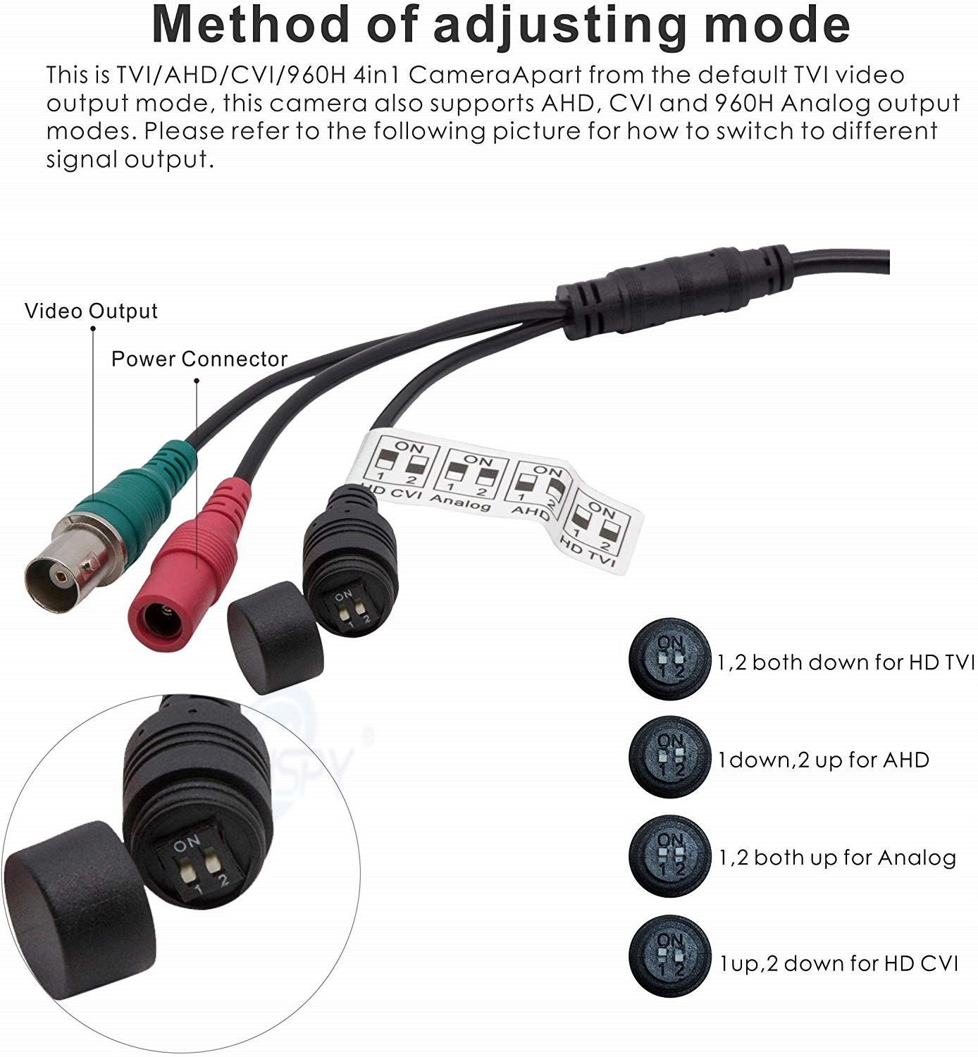 - Wyjście wideo: TVI / CVI / AHD / CVBS przełączane * 1080P przy 30fps AHD (domyślnie)