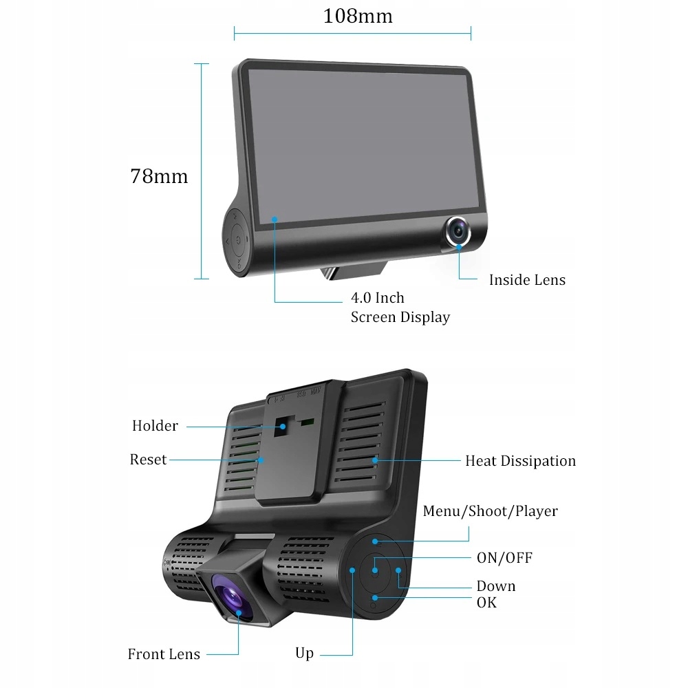 1x 4″ dwuobiektywowa kamera samochodowa