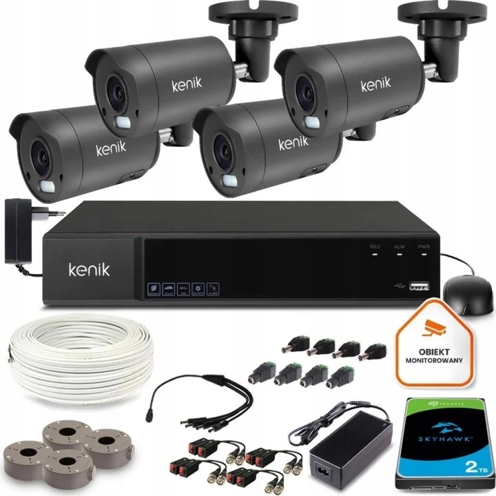 Zestaw oparty o sprzęt marki Kenik, oferujący obraz w jakości FullHD, 4 kamery przeznaczone do zastosowań zewnętrznych jak i wewnętrznych np. monitoring domu, sklepu. Gwarantowany zapis nagrań aż 44 dni. Dzięki diodom IR, kamera w całkowitej ciemności nadzoruje obszar do 30m.