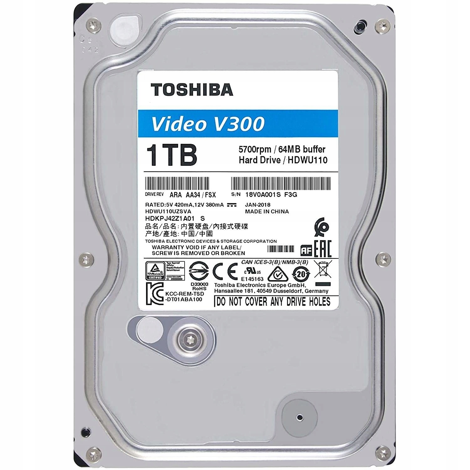 Dysk w zestawie to model serii V300 od firmy Toshiba Dyski serii S300/V300 to rozwiązania dedykowane do pracy 24/7 w systemach CCTV. Charakteryzują się wyższą żywotnością oraz odpornością na wysoką temperaturę pracy.