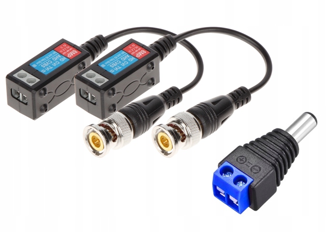 Do połączania przewodu z rejestratorem, kamerą i zasilaczem otrzymują Państwo komplet wtyków i konwerterów BNC na skrętkę: