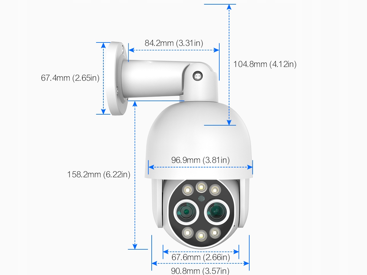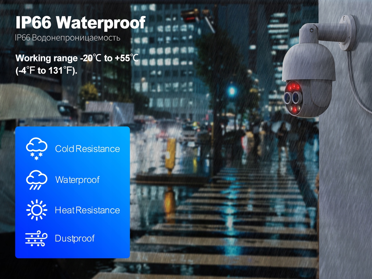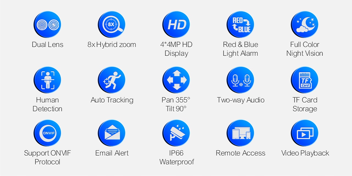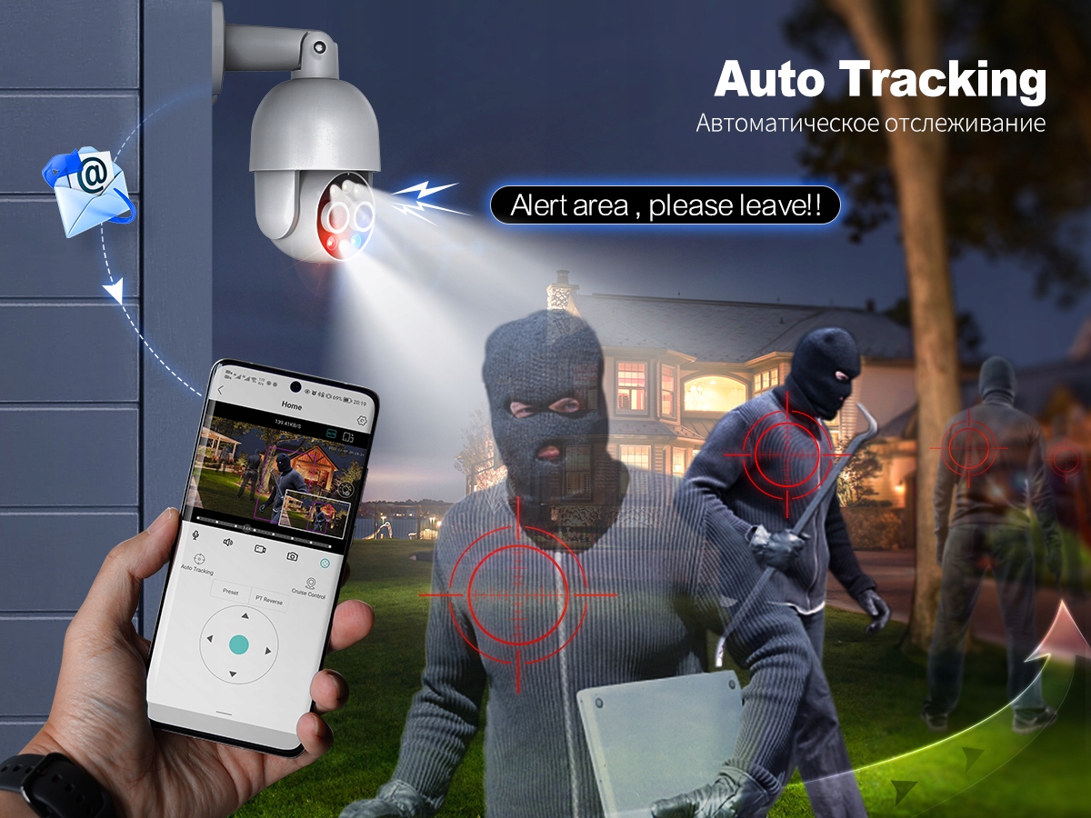 * Czerwono-niebieskie Alarm świetlny: po wykryciu człowieka czerwone i niebieskie światło będą migać na przemian, aby odstraszyć intruzów.