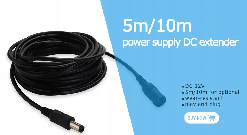 Opcjonalnie posiadamy przedłużacz kabla Kamera – zasilacz 5m oraz 10M